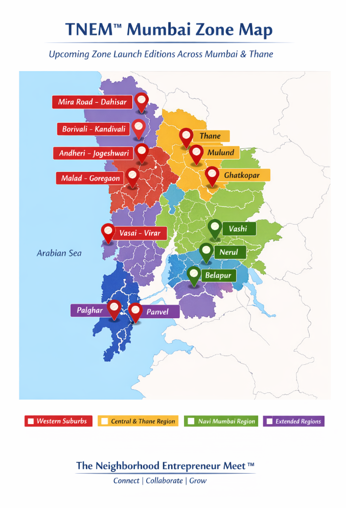 The Neighborhood Entrepreneur Meet™ is a monthly, zone-focused business networking platform designed to bring entrepreneurs, MSMEs, startups, and professionals together in a structured, trust-driven environment.